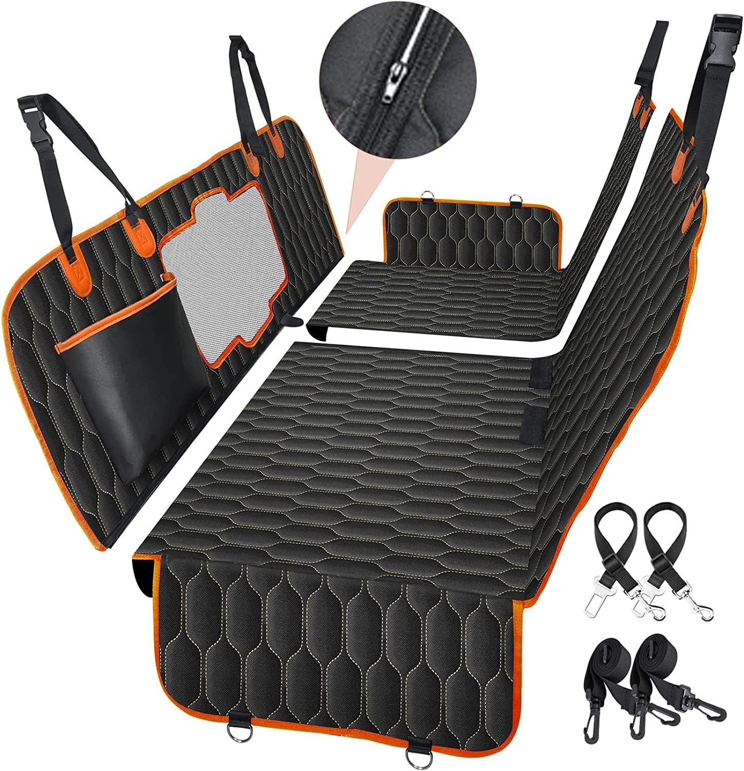 Refined Quality Level up Your Car! – Crafted with 5 layers cloths,  100% scratchproof and water-resistant qualitySupports Pet Weigh up to 90 Lbs.Designed with 3 zippers making installing and taking down easyMore Ways to Open it! – The dog car seat cover for back seat with side flaps can be easily shifted into hammock styles, keeping doggie from jumping on the door handles & window sills and sliding off the seat at sudden stops;Can be converted into dog hammockThe dog seat cover for SUV with adjustable straps adapts to  most  Cars and SUV4 buckles straps and 2 seat anchors help your dog car seat cover for back seat secured to its place on the road trip. The pet car seat covers backseat comes with nonslip backing and 2 velcro openings for seat belts so your kids can get in and buckle up without having to remove it