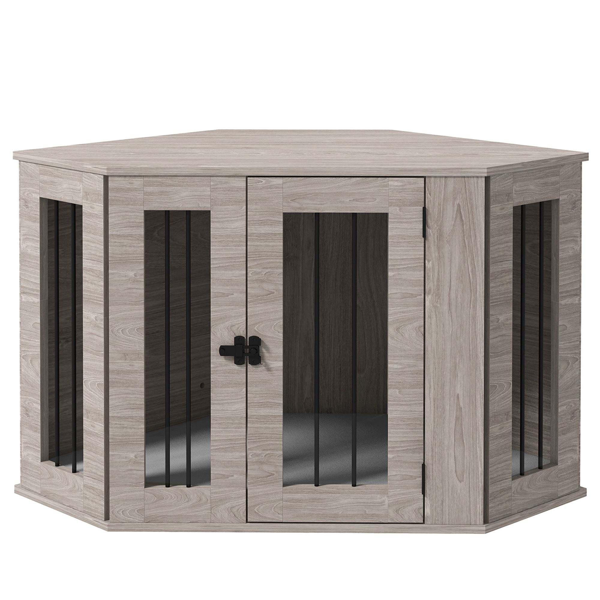 Enhance your space with this contemporary PawHut dog crate furniture, featuring modern design and natural wood grains. Its corner-friendly shape fits neatly against walls or furniture. The spacious door provides easy access, and the washable cushion ensures cleanliness. Enjoy lasting durability and strength, designed to withstand daily use.