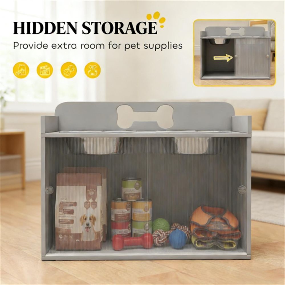 Elevated dog bowl with storage space, gray