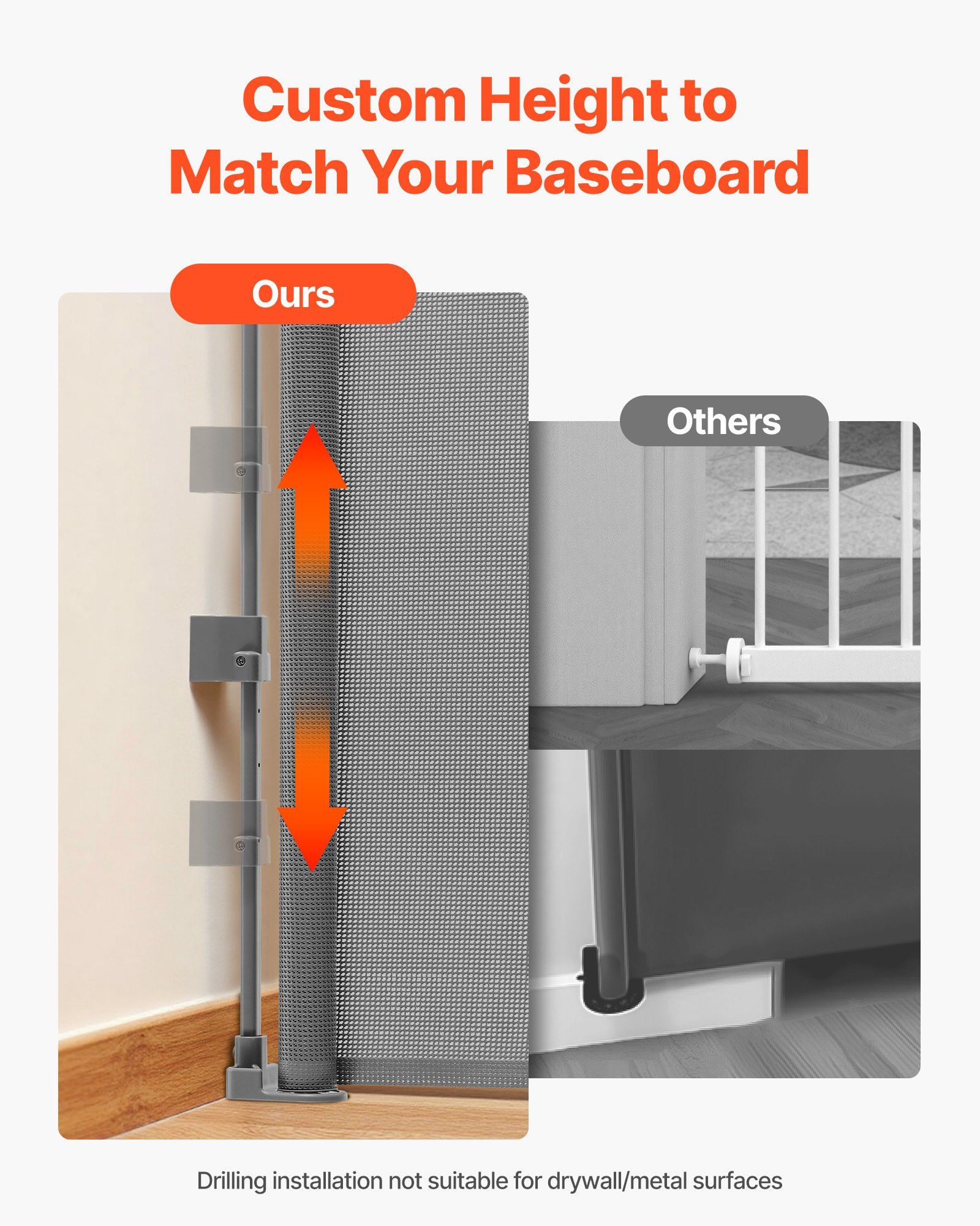 2.Damage-Free Baseboard Fit: Lower brackets can be adjusted vertically, allowing the retractable dog gate to be mounted over baseboards without damage. All hardware is included for quick and easy installation